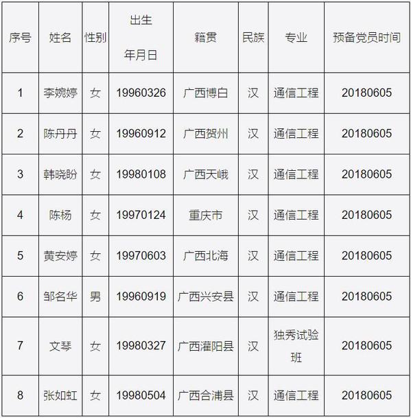 为严把党员“入口”关,保证新党员质量,增加发展党员工作的透明度,防止和克服发展党员工作的不正之风,根据中组部的要求,现将拟本科通信工程党支部转正的预备党员的基本情况公示如下,请广大师生员工对以下公示对象进行监督。