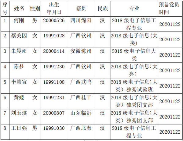 为严把党员“入口”关,保证新党员质量,增加发展党员工作的透明度,防止和克服发展党员工作的不正之风,根据中组部的要求,现将本科生电子信息工程党支部拟转正的预备党员的基本情况公示如下,请广大师生员工对以下公示对象进行监督。